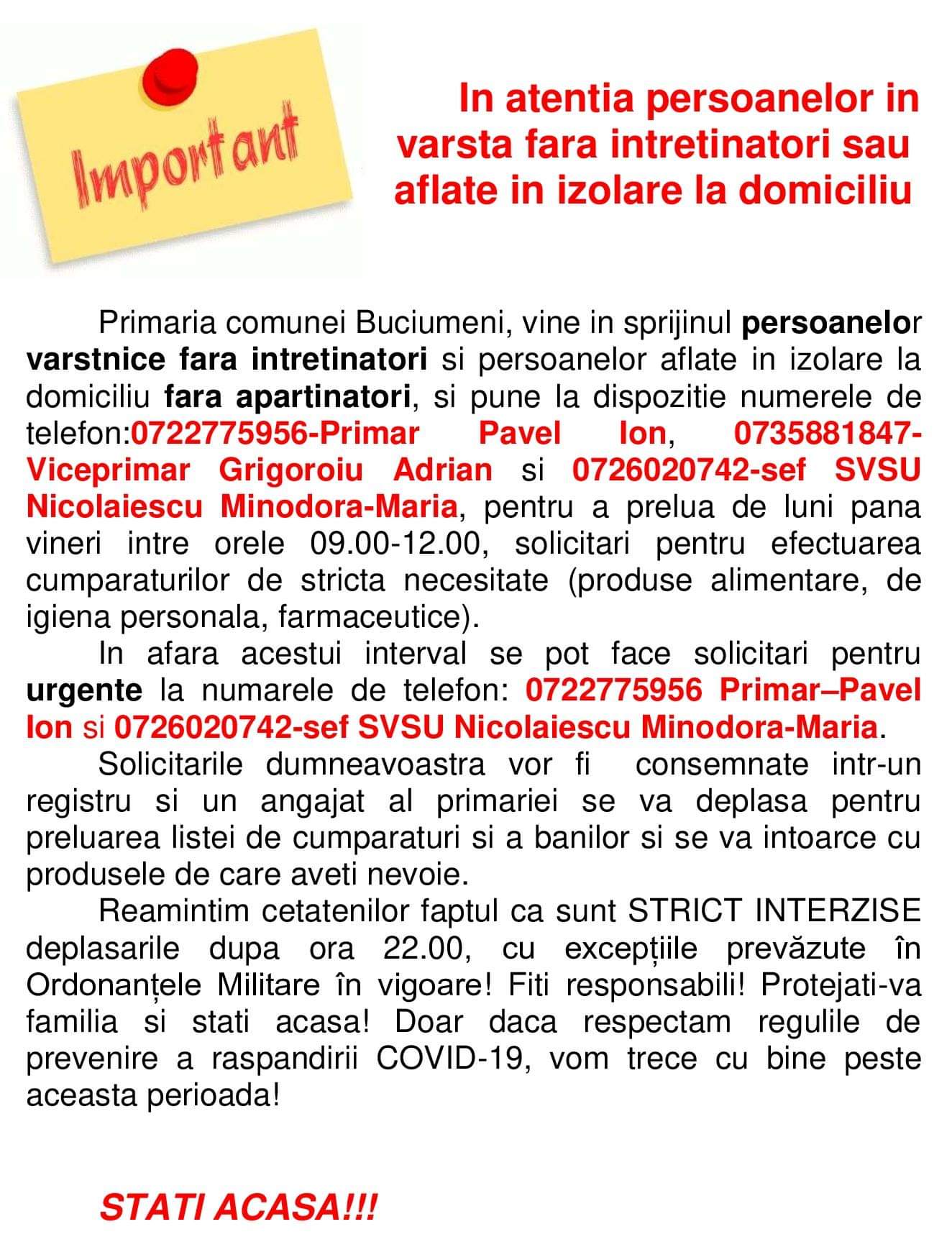Primăria comunei dâmbovițene Buciumeni vine în sprijinul persoanelor vârstnice fără întreținători și a persoanelor izolate la domiciliu fără aparținători.