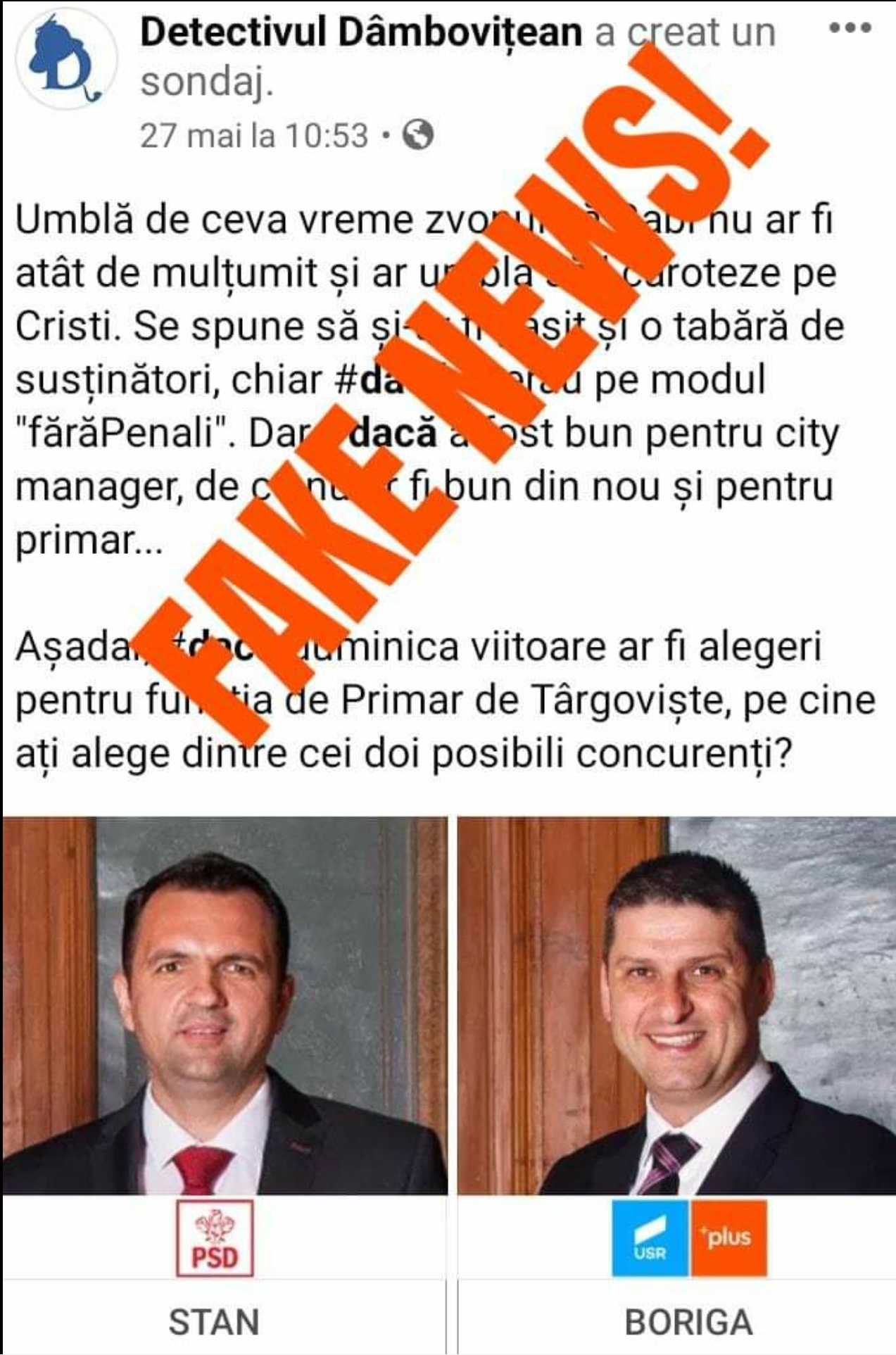 După ce o pagină de Facebook obscură a inițiat un așa zis sondaj de opinie prin care sunteți invitați să votați care dintre Cristian Stan, primarul în funcție (PSD) al municipiului Târgoviște și Gabriel Boriga, fostul edil PDL și actual administrator public, ar fi mai bun pentru fotoliul de primar, USR PLUS DÂMBOVIȚA reacționează, deoarece Boriga este prezentat ca potențial candidat al Alianței: