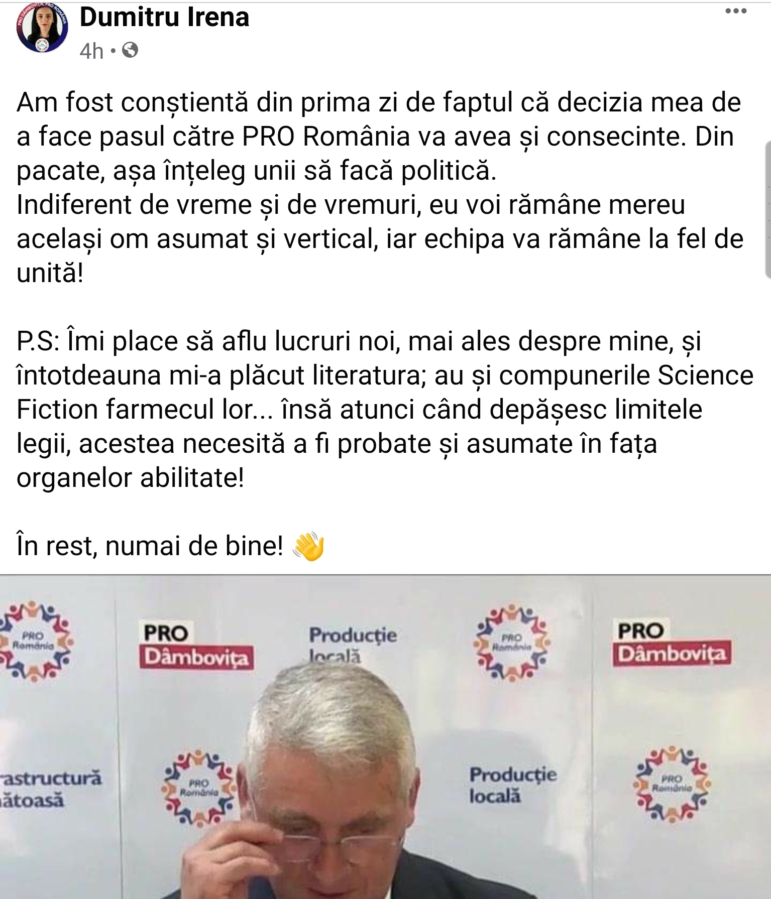 De asemenea, Dumitru Irena a ținut, ulterior, să publice pe Facebook următorul mesaj: