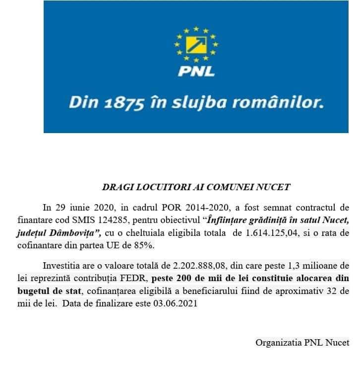 ,,Pe facebook PNL Nucet si facebook al candidatului PNL la funcția de primar al com Nucet, a apărut o postare pe care o voi reda mai jos, în care afirma ca in 29 iunie 2020, în cadrul POR, s-a semnat contractul de finanțare,, Înființare grădiniță în sat Nucet”, cu datele investiției, semnată PNL Nucet.”