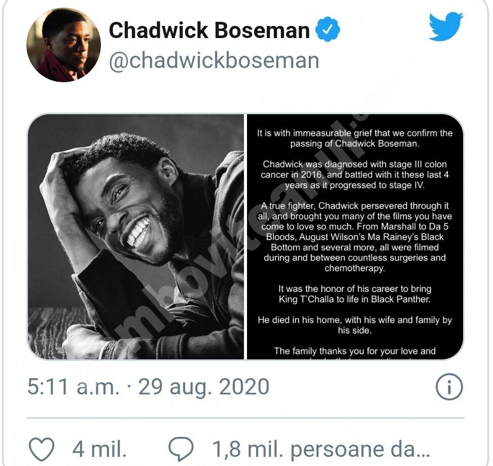 Conform mesajului transmis de familia actorului pe Twitter, acesta suferea încă din 2016 de cancer.