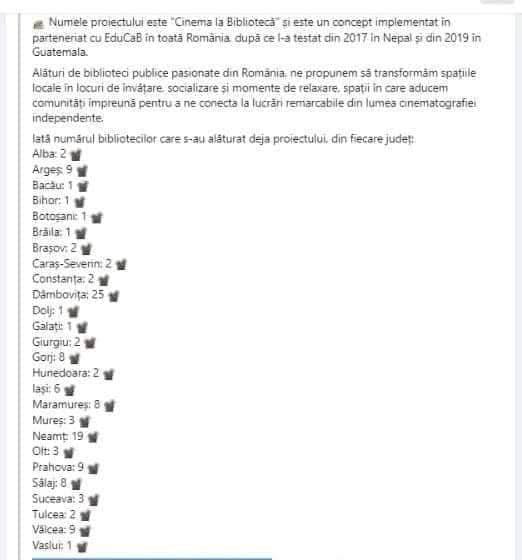 „Ne-am alăturat proiectului inițiat de Short Film Breaks și Romania EduCaB, prin care ne propunem să transformăm spațiul bibliotecii intr-un loc de învățare și socializare în lumea cinematografiei independente”, transmite echipa bibliotecii.