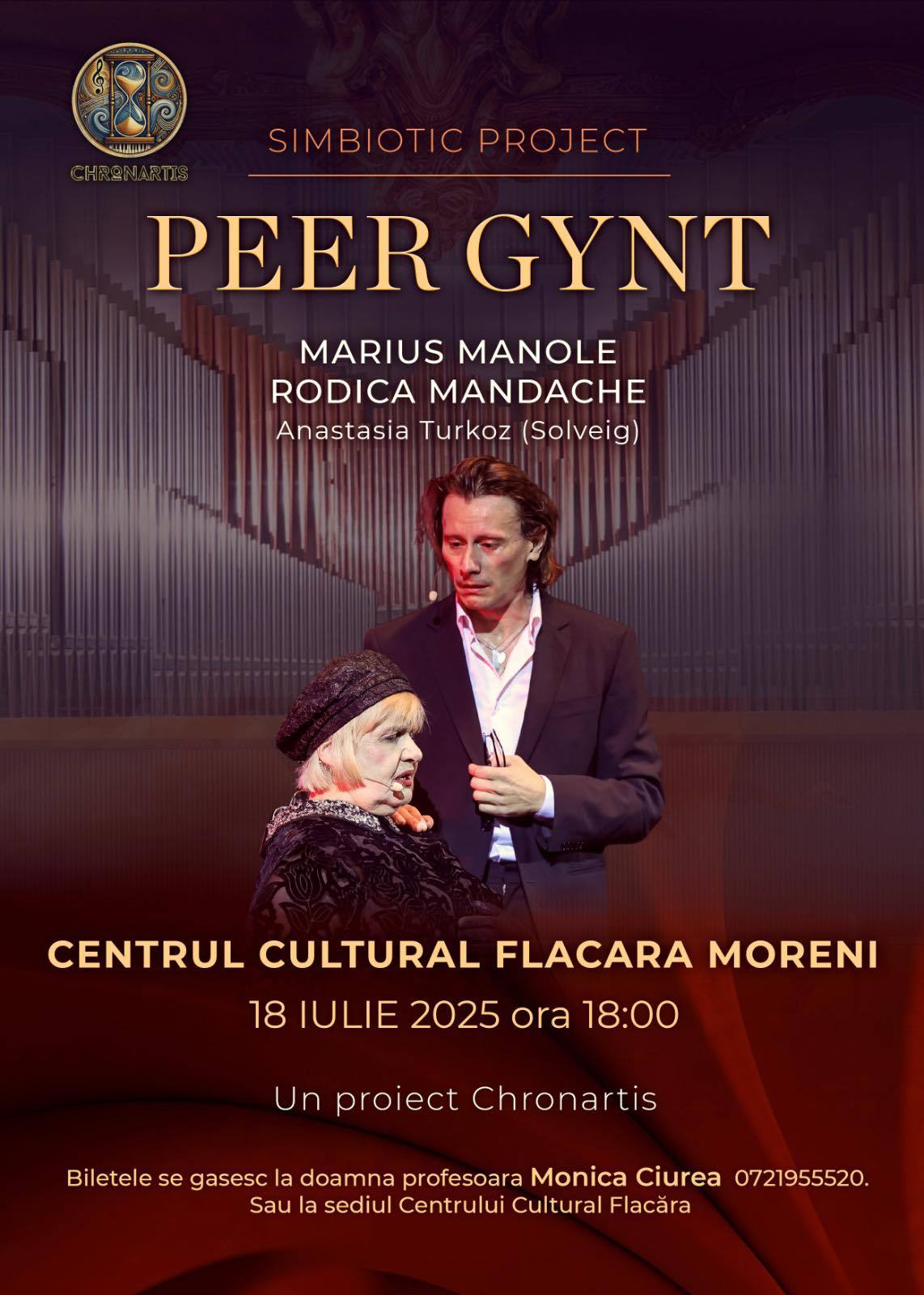 Seria manifestărilor culturale continuă, la Moreni, cu un eveniment de excepție. Primăria Municipiului Moreni aduce pe scena Centrului Cultural Flacăra, pe 18 iulie, spectacolul unic PEER GYNT. Cu acest prilej, vor urca pe scenă actorii Marius Manole și Rodica Mandache, alături de soprana Anastasia Turkoz.