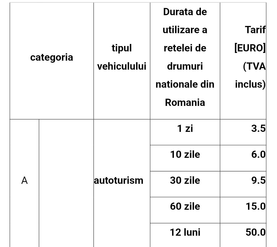 În acest sens, atașăm mai jos tabelul cu tarifele pentru rovinietă aplicabile în cazul autoturismelor, valabile începând cu data de 01.09.2025.