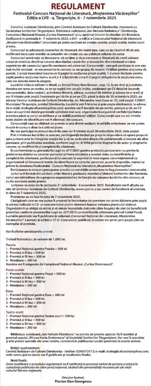 Consiliul Judeţean Dâmboviţa, prin Centrul Judeţean de Cultură Dâmboviţa, împreună cu Societatea Scriitorilor Târgovişteni, Biblioteca Judeţeană „Ion Heliade Rădulescu” Dâmbovița, Complexul Naţional Muzeal „Curtea Domnească” şi cu sprijinul Uniunii Scriitorilor din România, desfăşoară în perioada 6 – 7 noiembrie 2025, a LVII – a ediţie a Concursului Naţional de Literatură „Moştenirea Văcăreştilor”, structurat pe patru secţiuni de creaţie: poezie, proză scurtă, teatru scurt şi eseu.