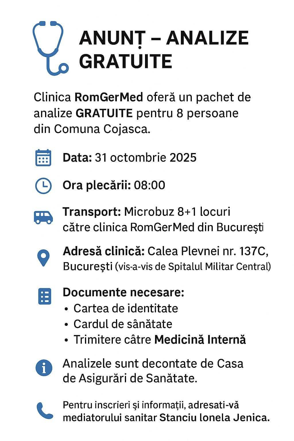Primăria Comunei Cojasca, în colaborare cu Clinica RomGerMed, oferă locuitorilor posibilitatea de a efectua analize medicale gratuite, decontate prin Casa de Asigurări de Sănătate.