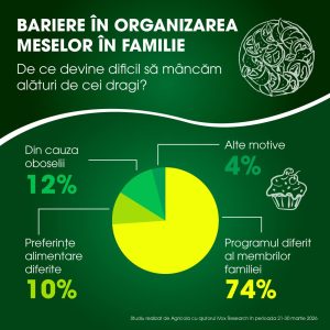 În apropierea Paștelui, una dintre perioadele din an în care masa în familie capătă o semnificație aparte, Agricola Internațional lansează studiul „Mesele în familie la români”, care arată că pentru români, mesele luate împreună sunt asociate cu alegeri alimentare mai bune, timp de calitate petrecut cu cei apropiați și mai multă grijă față de familie. Potrivit datelor, aproape 71% dintre respondenți spun că au o alimentație mai bună atunci când iau masa cu familia, iar peste 84% cred că mesele împreună contribuie la formarea unor obiceiuri alimentare sănătoase pe termen lung.